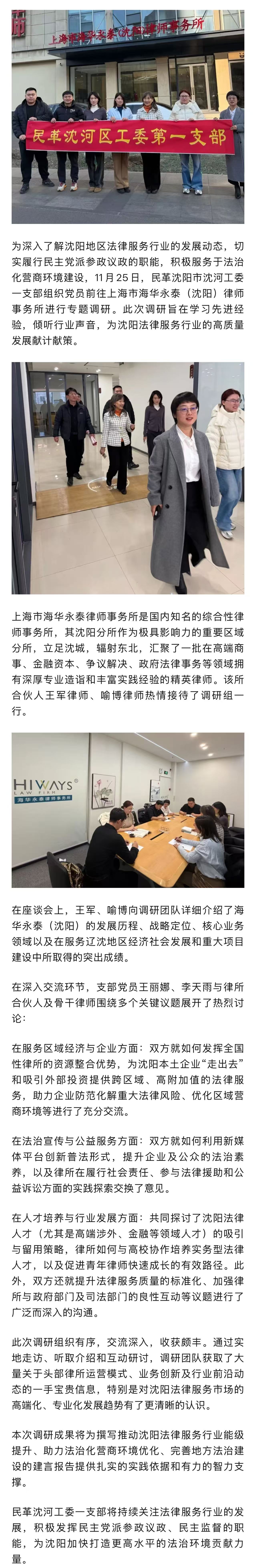 【调查研究】民革沈河工委一支部赴上海市海华永泰(沈阳)律师事务所开展法律服务专题调研