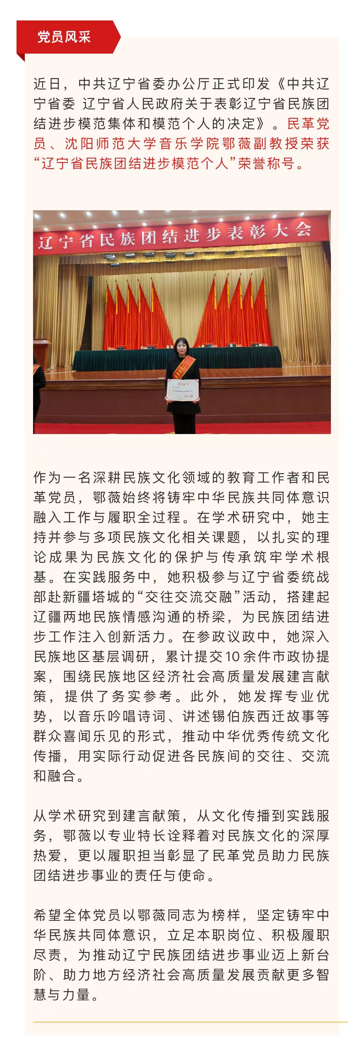 【党员风采】沈阳民革党员鄂薇荣获“辽宁省民族团结进步模范个人”称号