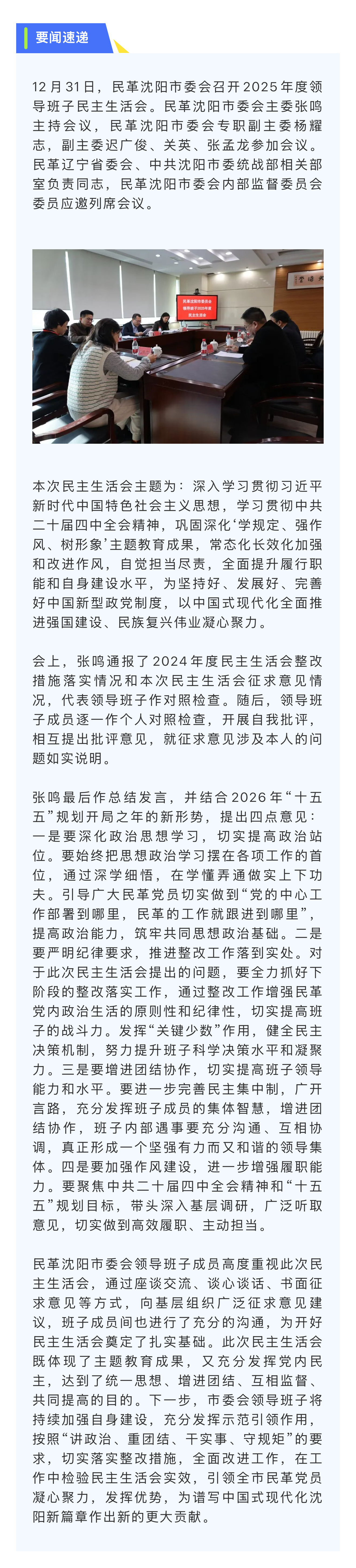 【要闻速递】民革沈阳市委会召开2025年度领导班子民主生活会
