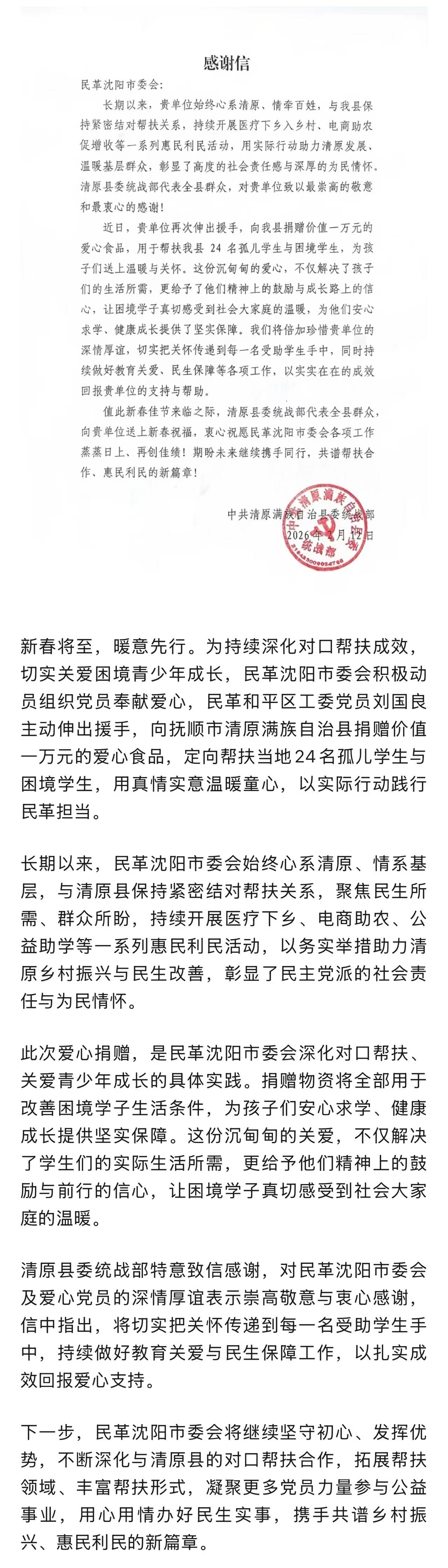 【要闻速递】对口帮扶显真情 民革爱心助成长——民革沈阳市委会爱心助学情暖清原
